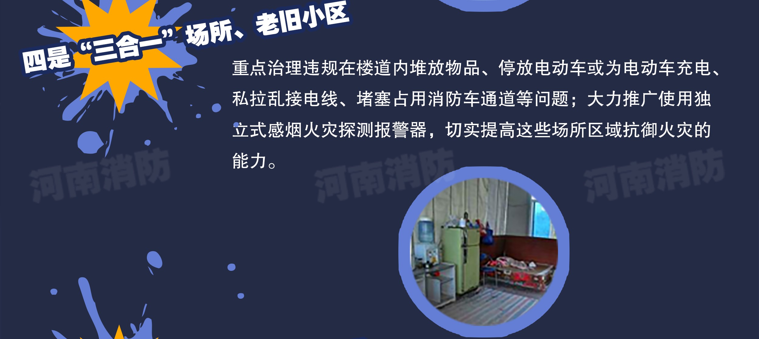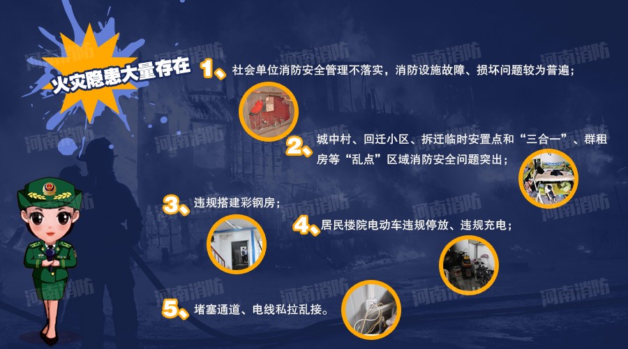 火災(zāi)隱患大量存在。社會單位消防安全管理不落實(shí),消防設(shè)施故障、損壞問題較為普遍;城中村、回遷小區(qū)、拆遷臨時安置點(diǎn)和“三合一”、群租房等“亂點(diǎn)”區(qū)域消防安全問題突出,違規(guī)搭建彩鋼房、居民樓院電動車違規(guī)停放、違規(guī)充電、堵塞通道、電線私拉亂接等問題尚未得到根治,火災(zāi)隱患整治、反彈,再整治、再反彈;社會消防法治意識依然淡薄,消防違法違規(guī)行為仍呈高發(fā)、多發(fā)態(tài)勢,建筑工程未審核先建設(shè)、未驗(yàn)收先使用的問題還比較突出。同時,一些火災(zāi)隱患整改難度大,還有大量的隱患存量,去年各級政府掛牌督辦的重大火災(zāi)隱患仍有105處沒有整改到位。